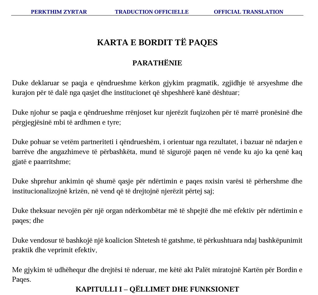 Askush nuk vë në dyshim rëndësinë e paqes si vlerë universale. Por paqja e eksportuar në arenën ndërkombëtare nuk mund të ndërtohet duke shkurtuar procedurat kushtetuese brenda vendit. Nëse sot rregullat e Kushtetutës anashkalohen për një marrëveshje që vetë quhet “Kartë e Paqes”, atëherë në emër të paqes globale, shkelet paqja juridike e rendit kushtetues të Shqipërisë.