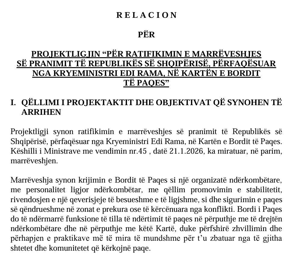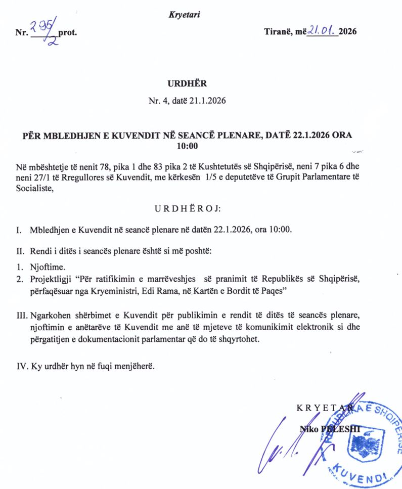Sot Kuvendi i Shqipërisë mblidhet në seancë plenare me një rend dite që në pamje të parë duket si procedurë rutinë parlamentare, por në thelb është një provë për respektimin e vetë Kushtetutës. Deputetët pritet të shqyrtojnë dhe miratojnë me procedurë të përshpejtuar “Kartën e Bordit të Paqes”, një dokument që qeveria e ka depozituar në Kuvend vetëm një ditë pasi e ka miratuar në parim në mbledhjen e Këshillit të Ministrave të datës 21 janar 2026.
