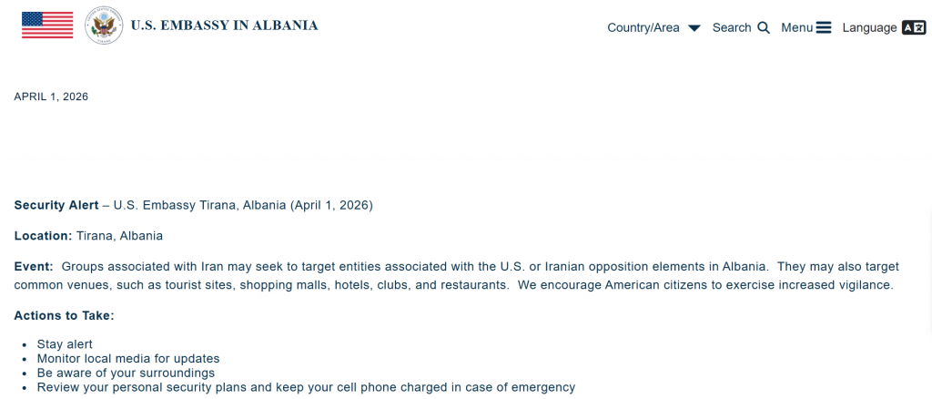 Ambasada e Shteteve tё Bashkuara tё Amerikёs nё Tiranё ka publikuar një njoftim sigurie për qytetarët amerikanë në Shqipëri, duke paralajmëruar për një rrezik të mundshëm nga grupe të lidhura me Iranin.