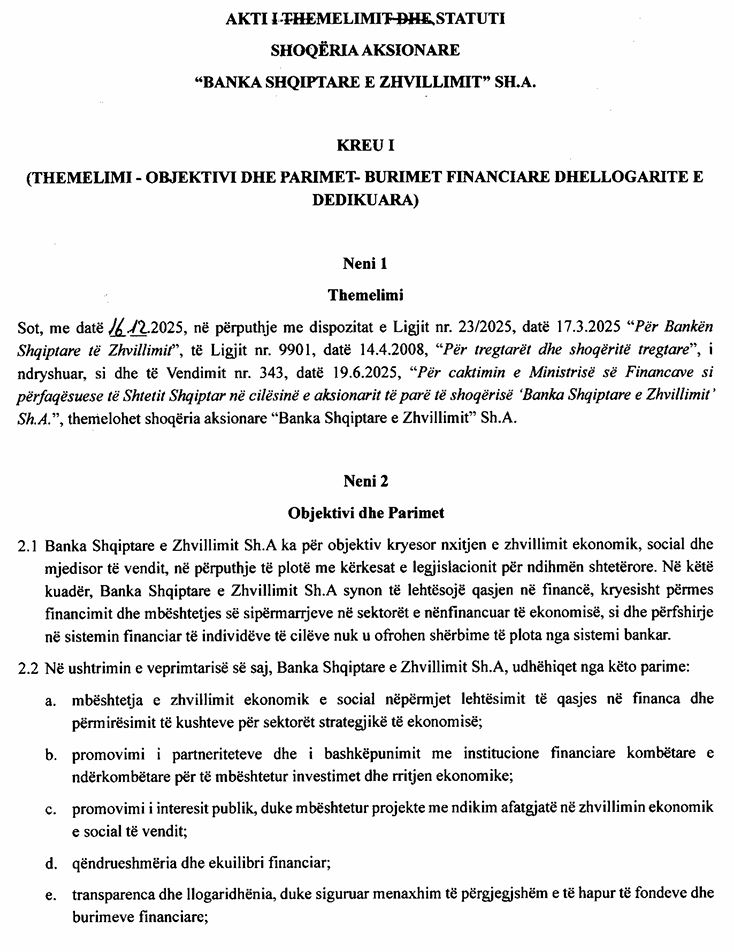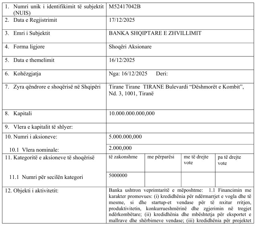 Dokumentet zyrtare të regjistrimit tregojnë se Banka Shqiptare e Zhvillimit (BZH) është krijuar si shoqëri aksionare me kapital fillestar plotësisht shtetëror dhe me objekt aktiviteti të gjerë financiar. Deri këtu, modeli i një banke zhvillimi duket normal. Por mjafton të lexosh me kujdes statutin për të kuptuar se kjo bankë nuk është thjesht institucion zhvillimor, por ajo pranon depozita, jep kredi, ofron garanci, emeton instrumente borxhi dhe investon fonde në treg. Me fjalë të tjera, sillet si bankë e mirëfilltë tregtare, por me një ndryshim thelbësor: “BZH” nuk licencohet dhe nuk mbikëqyret nga Banka e Shqipërisë si çdo bankë tjetër që merr depozita nga publiku.