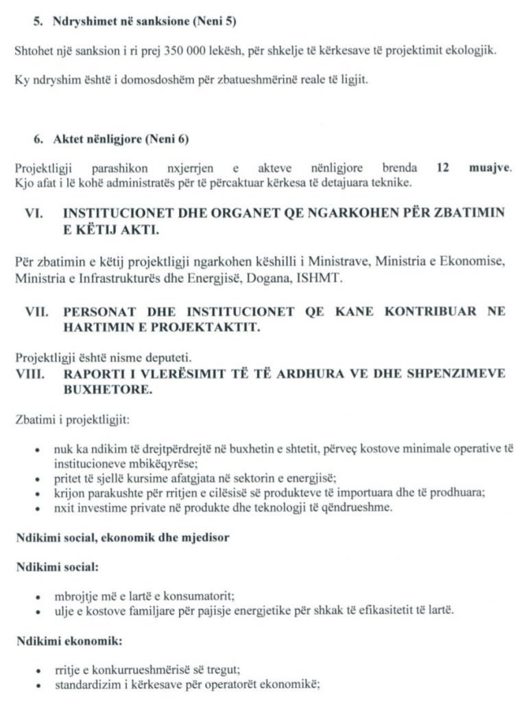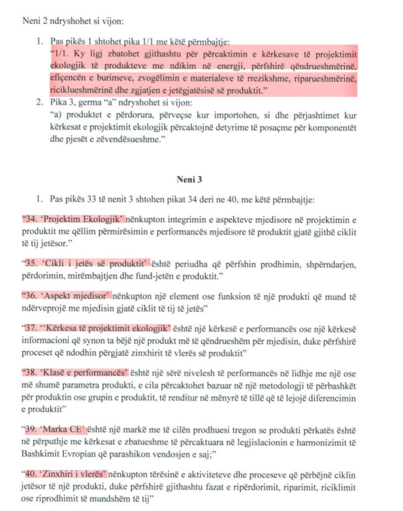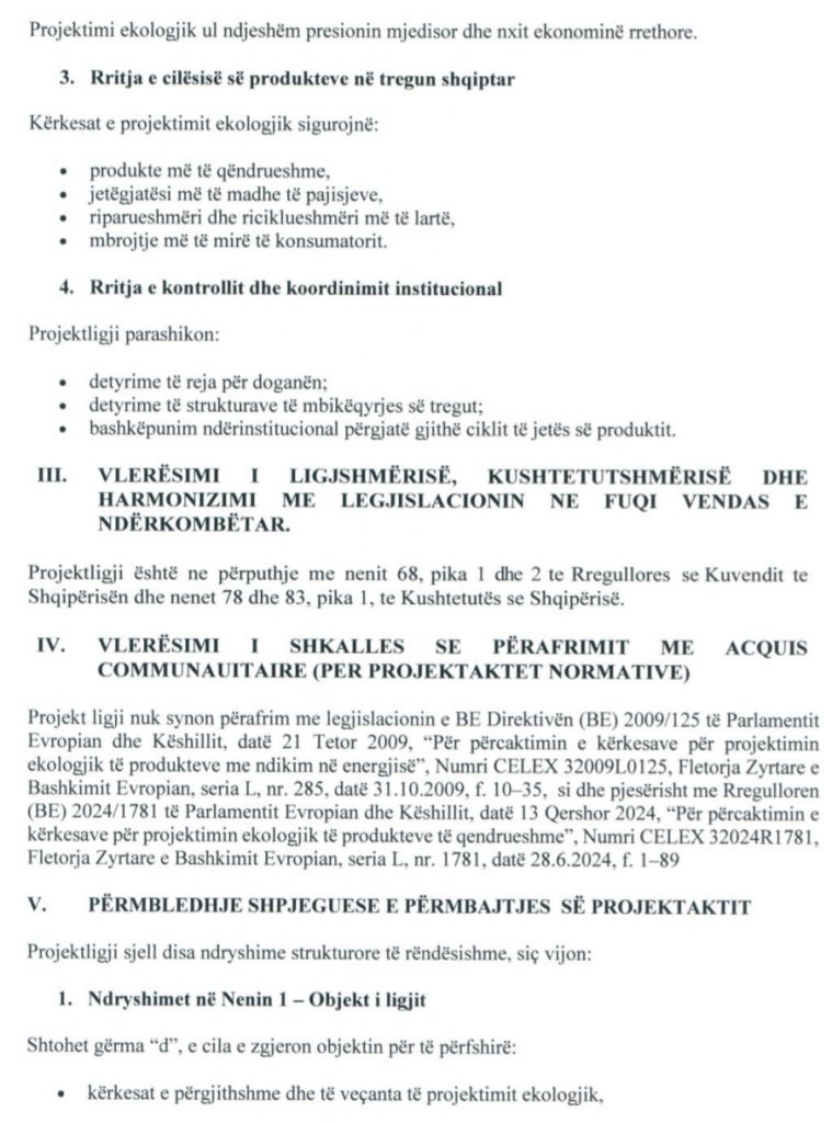 Sipas projektit, mund të përfshijnë kufizimin e konsumit të energjisë, përdorimin e burimeve, zvogëlimin e materialeve të rrezikshme, riparueshmërinë dhe riciklueshmërinë. Po aty ngarkohet prodhuesi, furnizuesi, importuesi apo tregtari të përgatisë dosjen teknike me analizën e ciklit të jetës dhe dokumentacionin provues; dogana verifikon përputhshmërinë në import; strukturat e mbikëqyrjes kontrollojnë produktet në qarkullim; dhe shkelja dënohet me gjobë 350 mijë lekë.