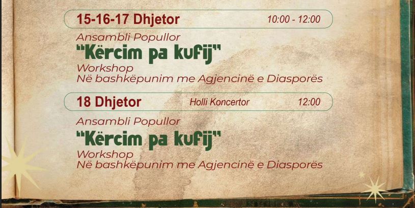 15–16–17 dhjetor, ora 10:00–12:00, Workshop “Kërcim pa kufij”- Ansambli Popullor, në bashkëpunim me Agjencinë e Diasporës, organizon një workshop të hapur që sjell kërcimin tradicional si gjuhë bashkimi dhe komunikimi kulturor.