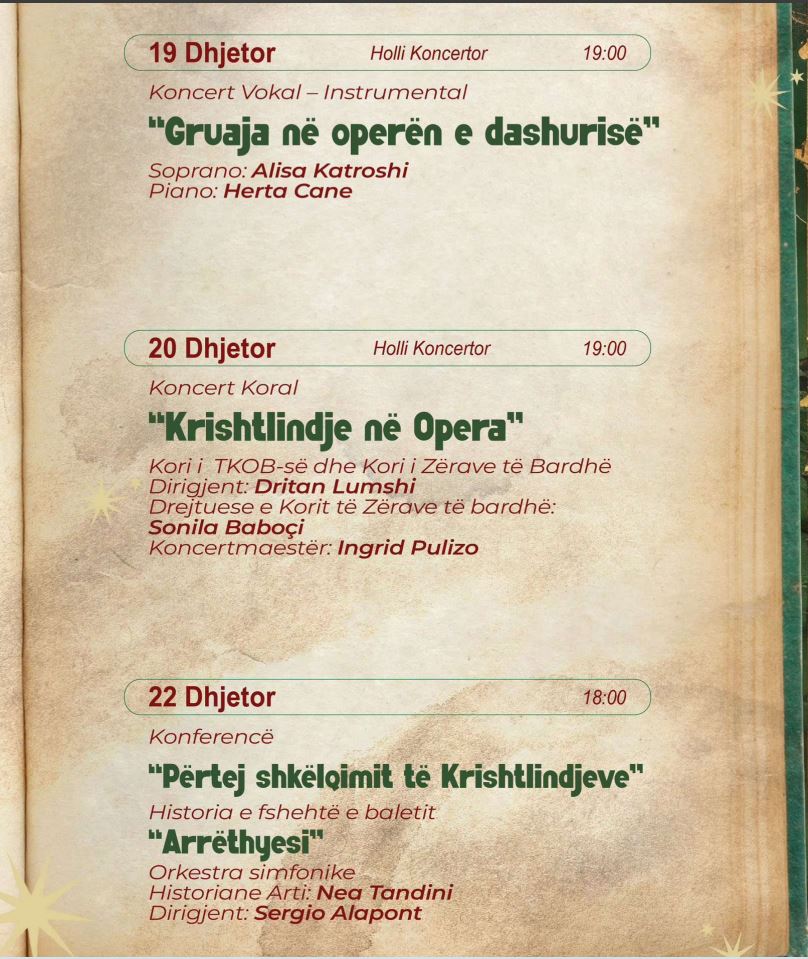 Duke nisur nga 14 dhjetori e deri në fund të muajit, Teatri Kombёtar i Operas dhe Baletit ёshtё një pikëtakim i rëndësishëm kulturor për publikun e çdo moshe, me një kalendar të pasur aktivitetesh që ndërthurin klasiken, traditën dhe emocionin e festave. Çdo mbrëmje hapet si një kapitull i ri, ku muzika, vallja dhe zëri bashkohen në një skenë të vetme.