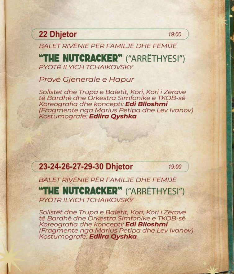 23, 24, 26, 27, 29 dhe 30 dhjetor, ora 19:00, Balet për familje dhe fëmijë – “The Nutcracker” (“Arrëthyesi”) – P. I. Tchaikovsky. Me solistët dhe trupën e baletit, korin, Korin e Zërave të Bardhë dhe Orkestrën Simfonike të TKOBAP-së.