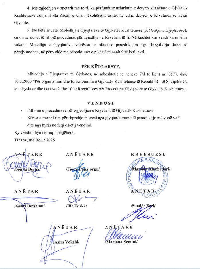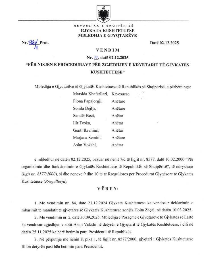 Gjykata Kushtetuese ka zyrtarizuar nisjen e procedurave për zgjedhjen e Kryetarit të ri, me një vendim të miratuar më 2 dhjetor 2025. Lajmi u konfirmua përmes njoftimit zyrtar të Mbledhjes së Gjyqtarëve, të drejtuar nga kryesuesja Marsida Xhaferllari, i cili përcakton edhe afatin 5-ditor për paraqitjen e shprehjes së interesit nga gjyqtarët e trupës kushtetuese.