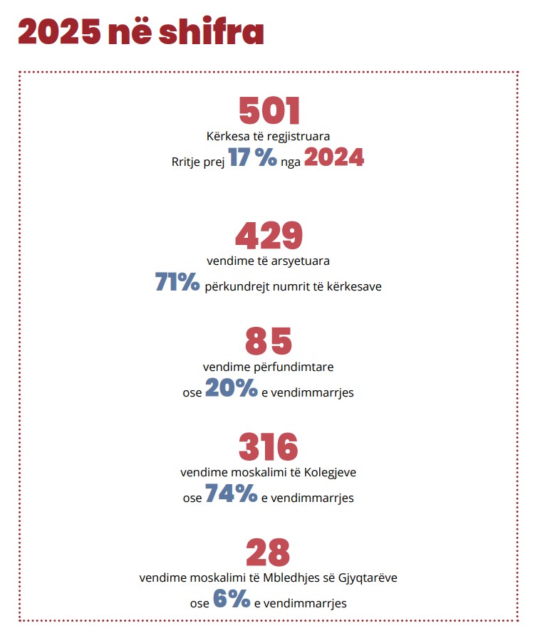 Ndërkohë, shifra prej 429 vendimesh të arsyetuara përbën 71% të kërkesave, por kjo përfshin edhe vendimet e moskalimit nё gjykime– pra nuk është një tregues i drejtpërdrejtë i drejtësisë substanciale, por më shumë i procedurës së refuzimit.