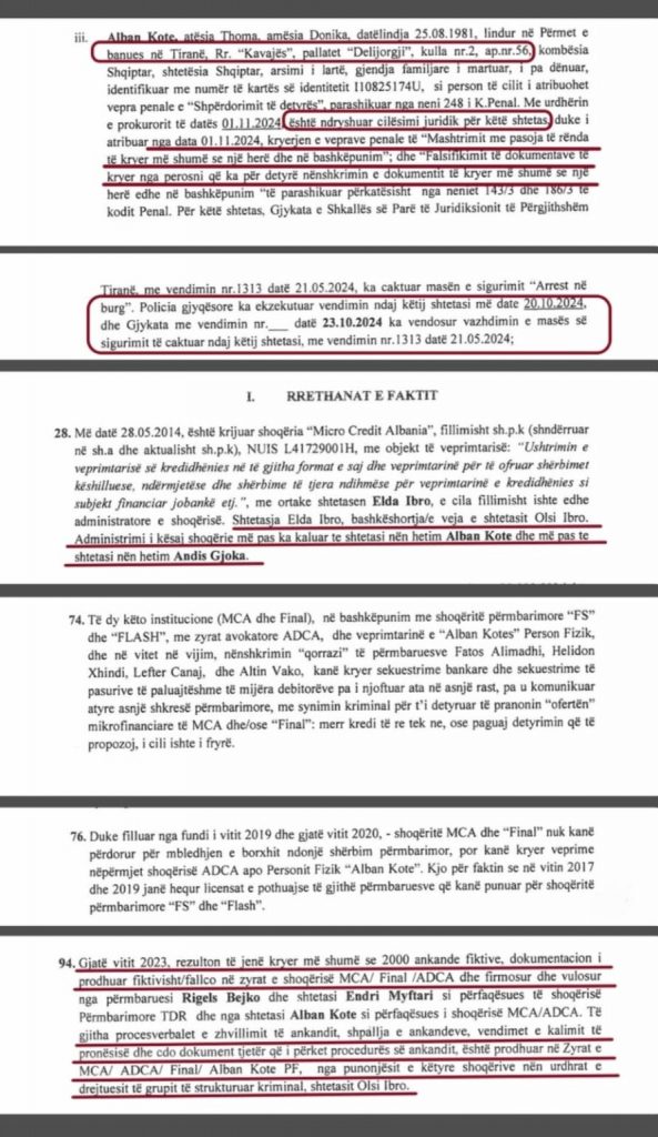 Pesë muaj para “arrestimit” të Alban Kotes, në maj 2024, Prokuroria e Tiranës me prokurorët Antoneta Sevdari, Ndini Tavani dhe Arben Agovi bëri një goditje të fortë, duke kërkuar arrestimin e 9 anëtarëve të bandës së mikrokredive që kishin ngritur skemën e mashtrimit me kredi dhe kërkoi sekuestrimin e aseteve të tyre.