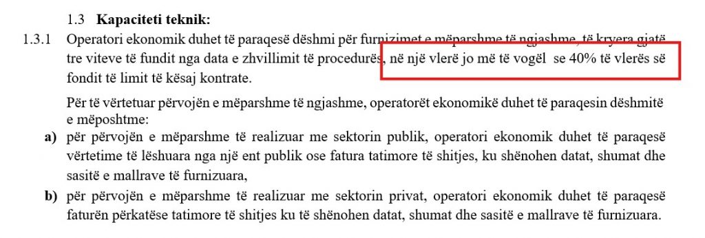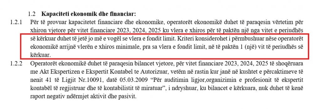 Operatorëve u kërkohet një xhiro vjetore jo më e vogël se vetë fondi limit në të paktën një nga vitet e fundit. Ky kriter, i vendosur në këtë nivel, nuk është neutral. Ai përjashton automatikisht operatorë të rinj apo të mesëm dhe lë në garë vetëm kompani të konsoliduara, duke e ngushtuar edhe më tej konkurrencën reale. Në një treg të vogël si ai shqiptar, kjo nuk është thjesht një kërkesë financiare — është një seleksionim paraprak i pjesëmarrësve.