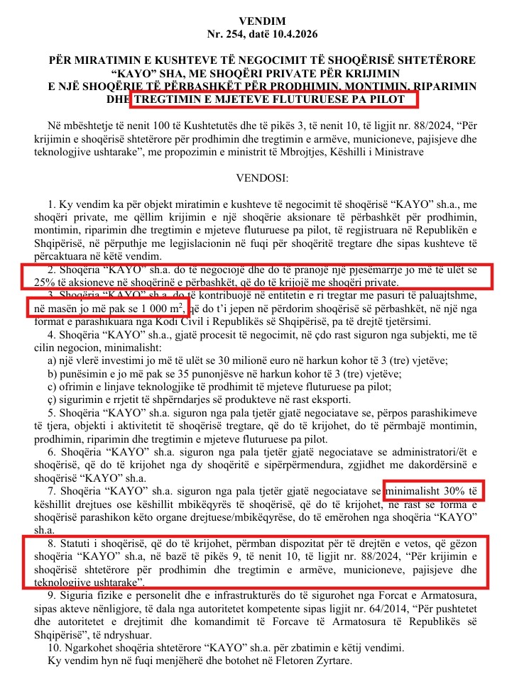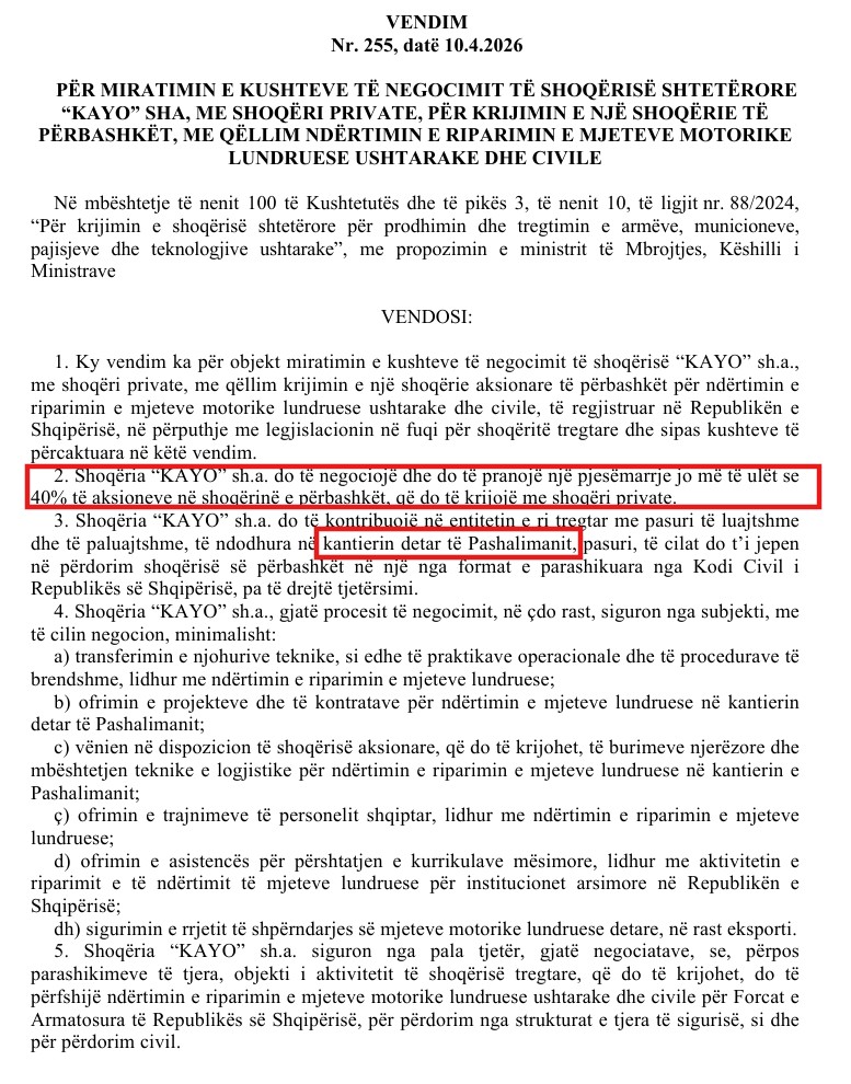 Dy vendimet e Këshillit të Ministrave të datës 10 prill 2026 e zbёrthejnё mё mirrё këtë skemë. Njëri prej tyre i hap rrugë krijimit të një shoqërie të përbashkët për prodhimin e mjeteve fluturuese pa pilot – dronëve, me pak fjalë – ndërsa tjetri për ndërtimin dhe riparimin e mjeteve lundruese, ku në këmbim privatit do t’i vihet në dispozicion kantieri detar i Pashalimanit.