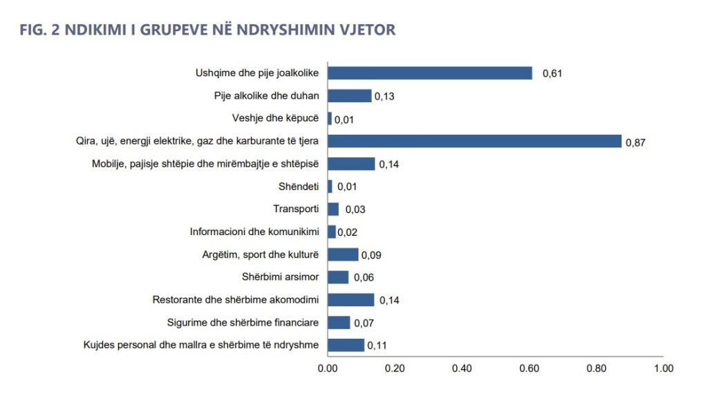 Sipas raportit, ndikimin më të madh në rritjen e çmimeve e dhanë kostot e banesës dhe energjisë, të cilat kontribuan me +0.87 pikë përqindje në inflacion, si dhe ushqimet dhe pijet joalkoolike me +0.61 pikë përqindje.