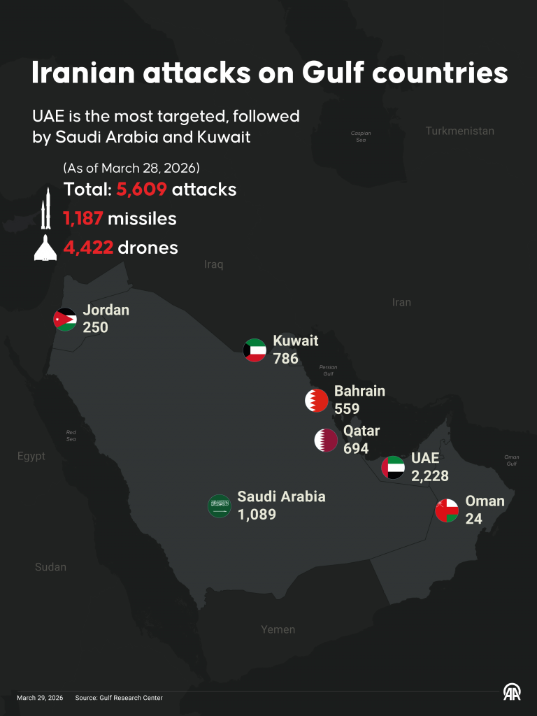 Irani ka goditur me raketa dhe dronë 5,609 herë mbi vendet që i konsideron armiqësore në brigjet përballë Ngushticës së Hormuzit, pa llogaritur goditjet e shumta që ka bërë në Izrael, Irak deri në baza të largëta në Oqeanin Indian, siç ishte sulmi i disa ditëve më parë në ishullin Diego Garcia.