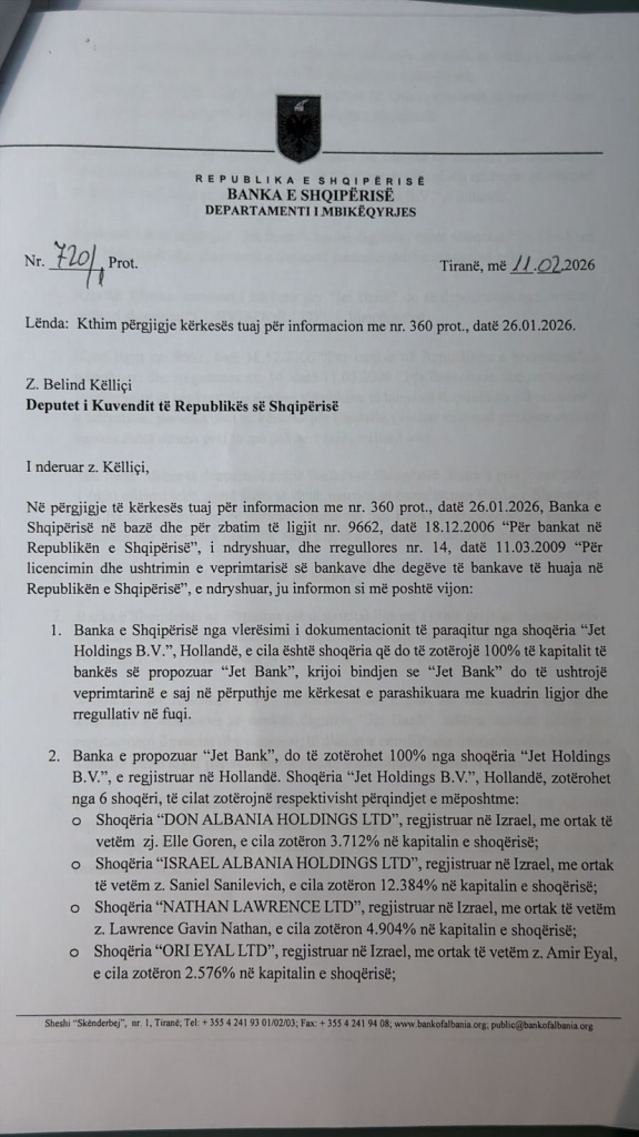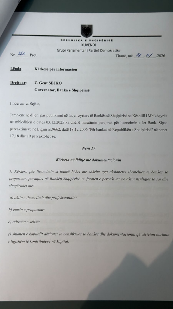 Për këtë arsye, në cilësinë e Deputetit të Kuvendit, i jam drejtuar Bankës së Shqipërisë me kërkesë për informacion të detajuar mbi: