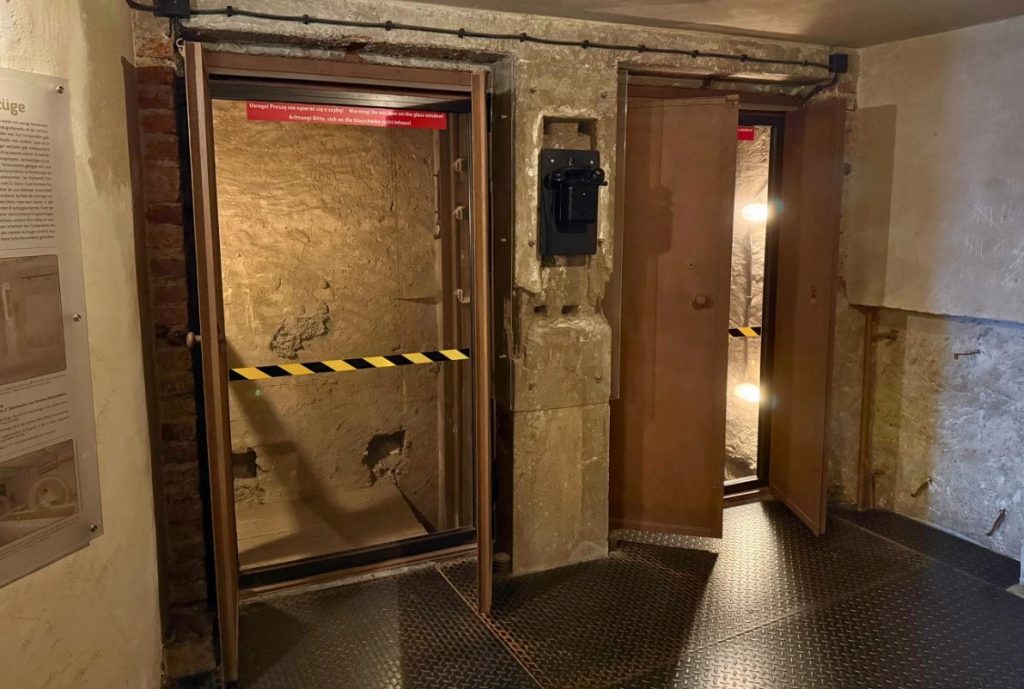 Megjithatë, kjo atmosferë madhështore ndërpritet papritur nga dy boshte ashensorësh të zymtë, të ndërtuar nga nazistët në vitin 1944. Ato zbresin rreth 50 metra nën kala, drejt bunkerëve dhe një kompleksi të madh nëntokësor, duke shënuar fillimin e kapitullit më të errët të historisë së saj.