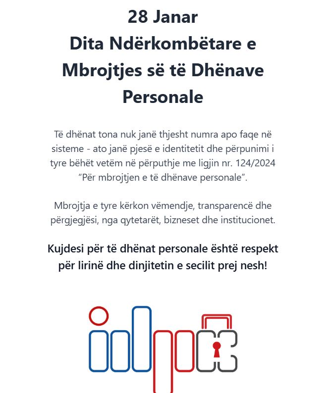 “28 janar – Dita Ndërkombëtare e Mbrojtjes së të Dhënave Personale! Respekto, ruaj dhe mbro të dhënat e tua personale. Komisioneri për të Drejtën e Informimit dhe Mbrojtjen e të Dhënave Personale.”