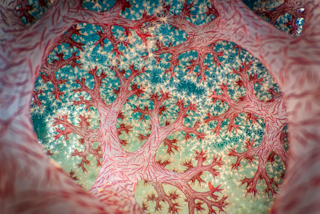 Gudgeon shpjegoi se korali mori emrin nga polipet e tij të shumta, të rrumbullakosura, që krijojnë një strukturë të fryrë dhe pothuajse abstrakte. Për ta realizuar, ai përdori një lente makro të zgjatur, duke fotografuar nga brenda degëve të koralit. Ngushtica Lembeh njihet si një nga zonat më të pasura për biodiversitet dhe një destinacion i preferuar për fotografët nënujore, edhe pse ndodhet pranë një porti të madh.
