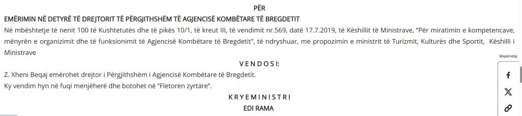 Dita e djeshme, 3 dhjetor 2025, solli një tjetër vendim të Këshillit të Ministrave që u përhap me shpejtësi pothuajse në çdo media: emërimin e Xheni Beqajt në krye të Agjencisë Kombëtare të Bregdetit. Vendimi është i qartë në formë dhe i thatë në përmbajtje, siç janë zakonisht aktet zyrtare: “Z. Xheni Beqaj emërohet Drejtor i Përgjithshëm i Agjencisë Kombëtare të Bregdetit. Ky vendim hyn në fuqi menjëherë dhe botohet në “Fletoren Zyrtare”. Ka kaq pak rreshta, por brenda tyre është ngjeshur një histori shumë më e madhe se thjesht emri i një drejtori të ri.