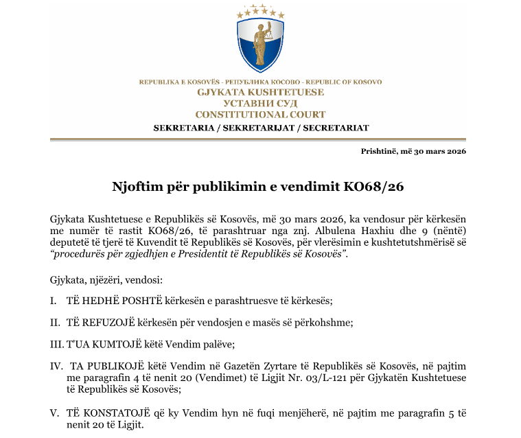 Në vendimin KO68/26, të publikuar më 30 mars 2026, Gjykata ka vendosur njëzëri të hedhë poshtë kërkesën për vlerësimin e kushtetutshmërisë, si dhe të refuzojë kërkesën për vendosjen e masës së përkohshme.