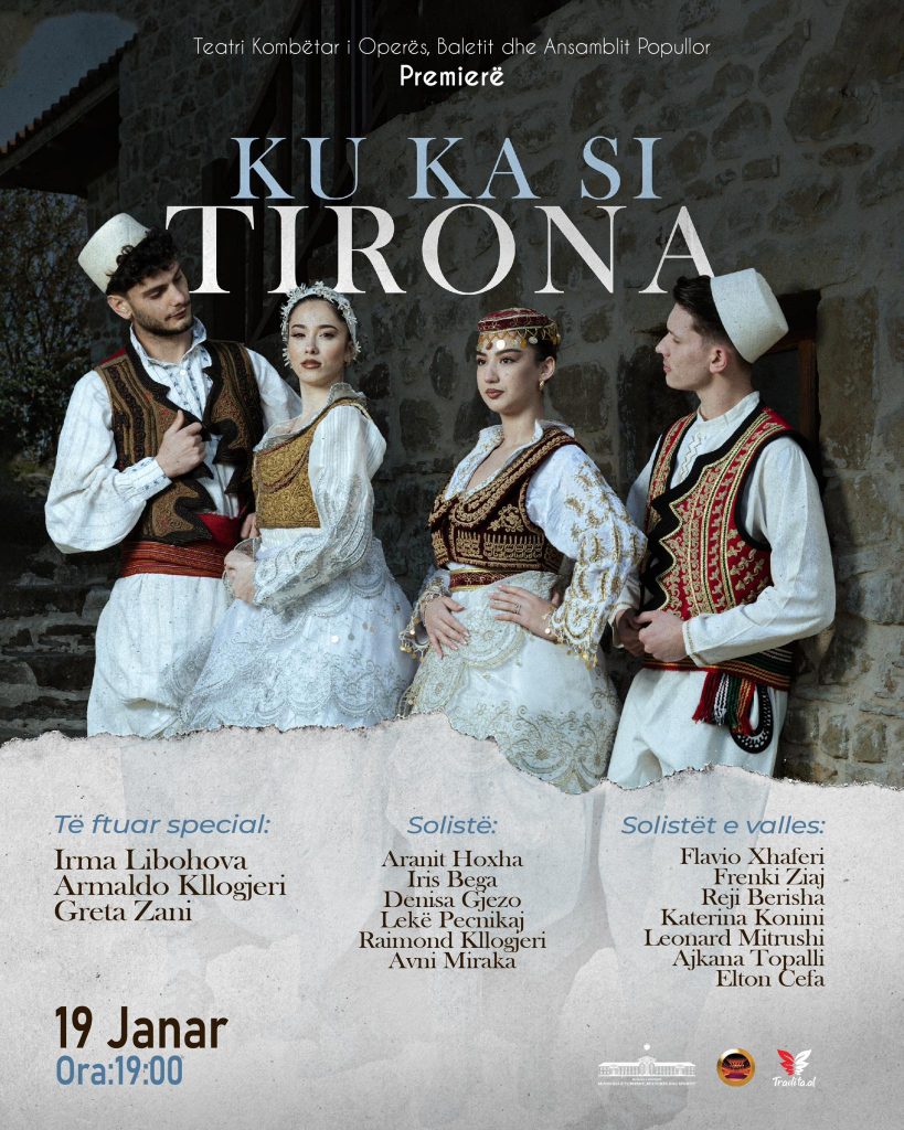 Tirana vishet me kostumin e saj më të bukur tradicional dhe ngjitet në skenë. Më 19 janar, në orën 19:00, Teatri Kombëtar i Operës, Baletit dhe Ansamblit Popullor sjell premierën e shfaqjes “Ku ka si Tirona”, një udhëtim artistik që i kushtohet historisë, ritmit dhe identitetit të kryeqytetit.
