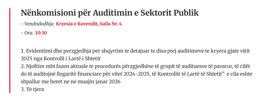 Institucioni që kontrollon përdorimin e parave publike në Shqipëri do të kalojë vetë në një proces kontrolli. Nënkomisioni për Auditimin e Sektorit Publik mblidhet sot në orën 10:30 në Kryesinë e Kuvendit për të shqyrtuar fazën aktuale të procedurës përzgjedhëse të audituesve të pavarur që do të auditojnë llogaritë financiare të Kontrollit të Lartë të Shtetit për vitet 2024-2025. Procesi i nisur synon t’i përgjigjet një pyetjeje të thjeshtë, por thelbësore për funksionimin e shtetit: kush e kontrollon institucionin që kontrollon gjithë të tjerët?