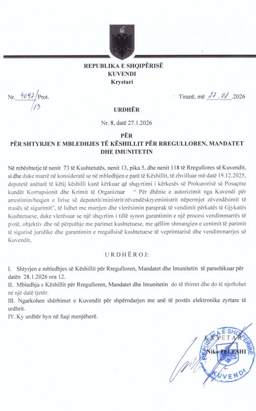 Në shkresë Niko Peleshi është porositur të shkruajë se mbledhja e radhës “do të lidhet me marrjen dhe vlerësimin paraprak të vendimit të Gjykatës Kushtetuese, për të garantuar një proces vendimmarrjeje të plotë, objektiv dhe në përputhje me parimet kushtetuese”.
