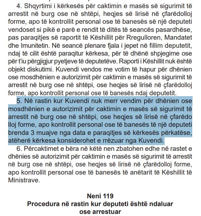 Pse? Sepse tek neni 118, pika 5 e Rregullores së Kuvendit, përcaktohet afati që ka një kërkesë për heqje imuniteti ndaj një deputeti. Ai është 3 muaj. Pra, nëse Kuvendi nuk merr vendim brenda tre muajve nga paraqitja e kërkesës së SPAK për autorizimin e arrestimit të një deputeti, kërkesa konsiderohet automatikisht e rrëzuar, sikur s’ka ekzistuar kurrë.