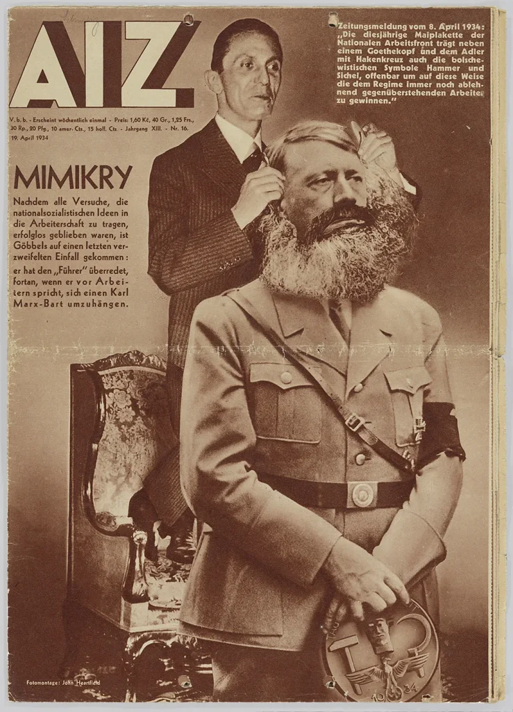 Në një kthesë të fortë politike, Heartfield paraqet Joseph Goebbels duke maskuar Hitlerin si Karl Marx për të mashtruar punëtorët. Fotomontazhi përdoret për të zbuluar manipulimin e pushtetit. Vepra të tilla krahasohen me memet politike të sotme: manipulimi i imazhit mund të mashtrojë, por edhe të zbulojë.