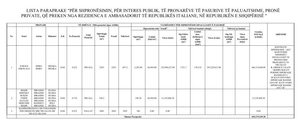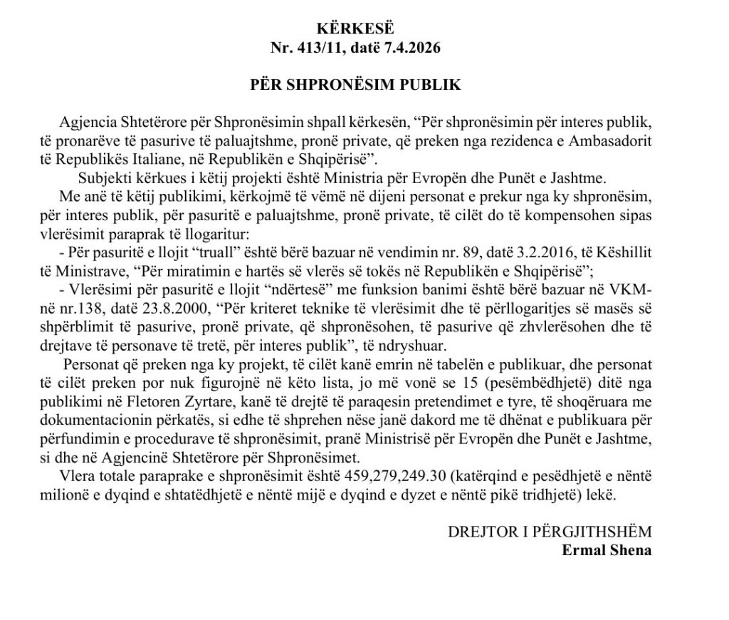 Një kërkesë e publikuar në Fletoren Zyrtare zbulon një projekt që, edhe pse duket i mbështetur në procedura ligjore, ngre një sërë pikëpyetjesh mbi mënyrën se si përdoren fondet publike dhe si interpretohet “interesi publik”. Bëhet fjalë për shpronësimin e disa pronave private qё preken nga rezidenca e ambasadorit të Italisë në Shqipëri – një ndërhyrje që sipas vlerësimit paraprak kap shifrën e 459 milionë lekëve.
