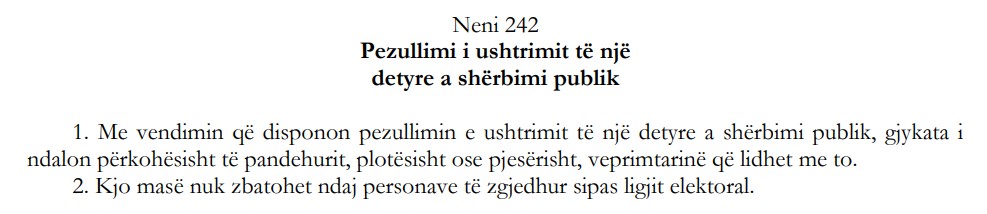 “Me vendimin që disponon pezullimin e ushtrimit të një detyre a shërbimi publik, gjykata i ndalon përkohësisht të pandehurit, plotësisht ose pjesërisht, veprimtarinë që lidhet me to. Kjo masë nuk zbatohet ndaj personave të zgjedhur sipas ligjit elektoral përfshi, Presidentin e Republikës, Kryeministrin, Anëtarët e Kabinetit Qeverisës, Avokatin e Popullit, Kreun e KLSH-së dhe Guvernatorin e Bankës së Shqipërisë”.