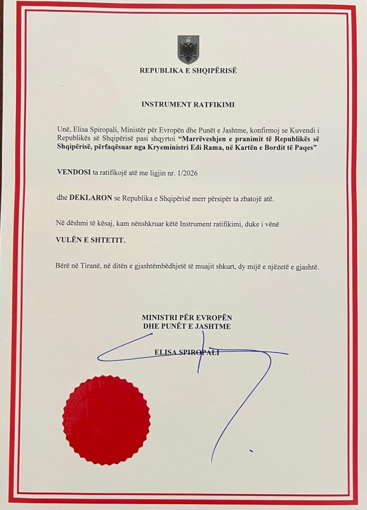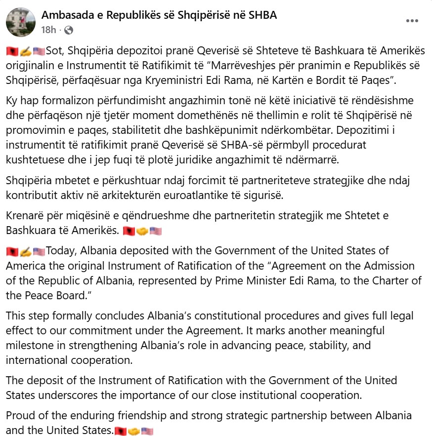 Ambasada njoftoi në faqen zyrtare në Facebook se Shqipëria depozitoi pranë Qeverisë së Shteteve të Bashkuara origjinalin e Instrumentit të Ratifikimit të “Marrëveshjes për pranimin e Republikës së Shqipërisë, përfaqësuar nga Kryeministri Edi Rama, në Kartën e Bordit të Paqes”.