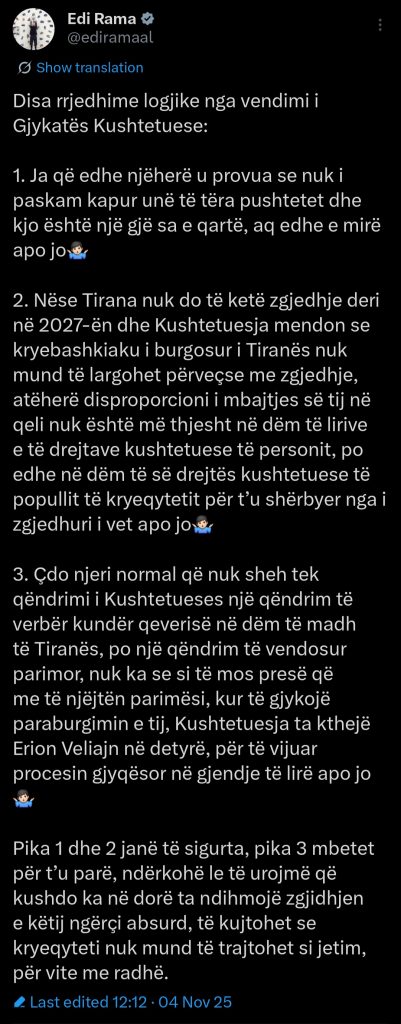 A do jetë po kaq parimore Gjykata Kushtetuese kur të gjykojë paraburgimin e Erion Veliajt? Kjo është pak a shumë pyetja e Ramës në X-in e tij.