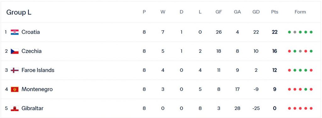 Për Grupin L, Kroacia mundi në Sarajevë 2-3 Bosnje Hercegovinën, me një gol në minutën e ’87 duke ruajtur supremacinë e vendit të parë, duke lënë pas për Play-off, Çekinë e cila bëri “spektakël” duke mundur Gjibraltarin 6-0.