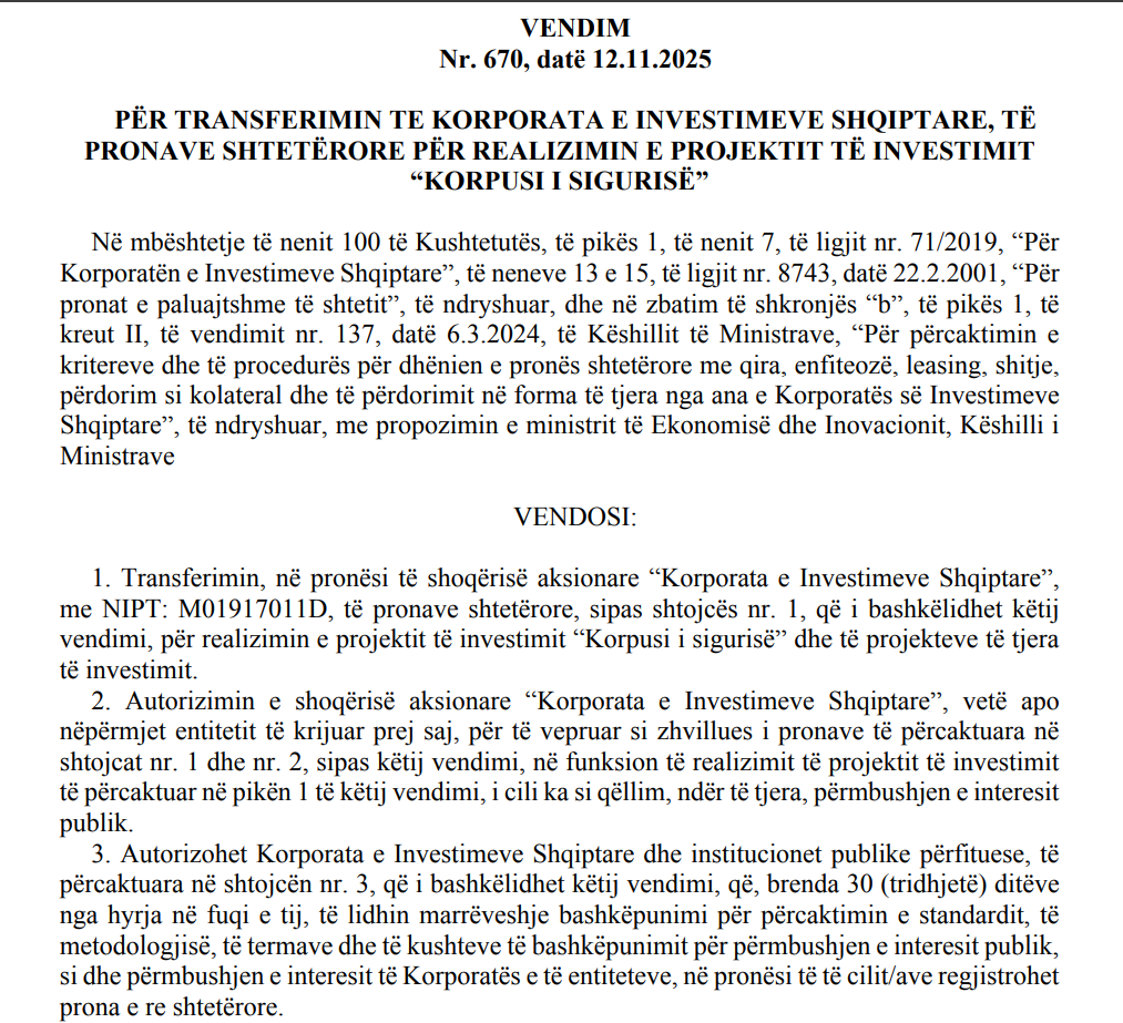 Në Fletoren Zyrtare nr. 212, të datës 14 nëntor 2025, është publikuar VKM nr. 670, datë 12.11.2025, “Për transferimin te Korporata e Investimeve Shqiptare, të pronave shtetërore për realizimin e projektit të investimit “Korpusi i Sigurisë” një vendim që dukshëm do të ketë ndikim të madh në hartën urbane dhe institucionale të Tiranës.