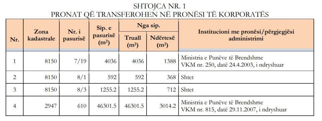 Me këtë vendim, qeveria transferon një seri pronash shtetërore strategjike në pronësi të Korporatës së Investimeve Shqiptare, duke i dhënë kësaj korporate kompetenca të pazakonta: të veprojë si zhvillues, të hapë procedura konkurruese me partnerë privatë, të negociojë kontrata, të konsolidojë pronat dhe, më e rëndësishmja, të kryejë prishjen e objekteve ekzistuese në këto prona për t’i zëvendësuar me ndërtime të reja.