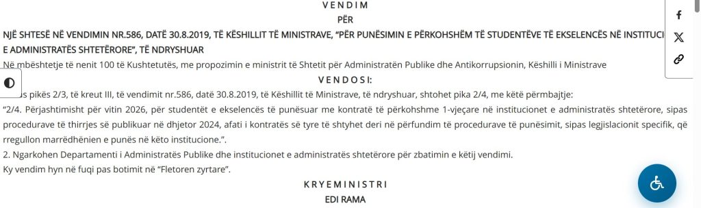 Në mbledhjen e sotme, Këshilli i Ministrave i Shqipërisë miratoi një shtesë në vendimin nr. 586, datë 30.8.2019, që lidhet me punësimin e përkohshëm të studentëve të ekselencës në institucionet e administratës shtetërore. Me propozim të ministrit të Shtetit për Administratën Publike dhe Antikorrupsionin, qeveria vendosi që, përjashtimisht për vitin 2026, studentëve të ekselencës të punësuar me kontratë njëvjeçare – sipas thirrjes së publikuar në dhjetor 2024 – t’u zgjatet afati i kontratës deri në përfundim të procedurave të rregullta të punësimit, sipas legjislacionit përkatës.
