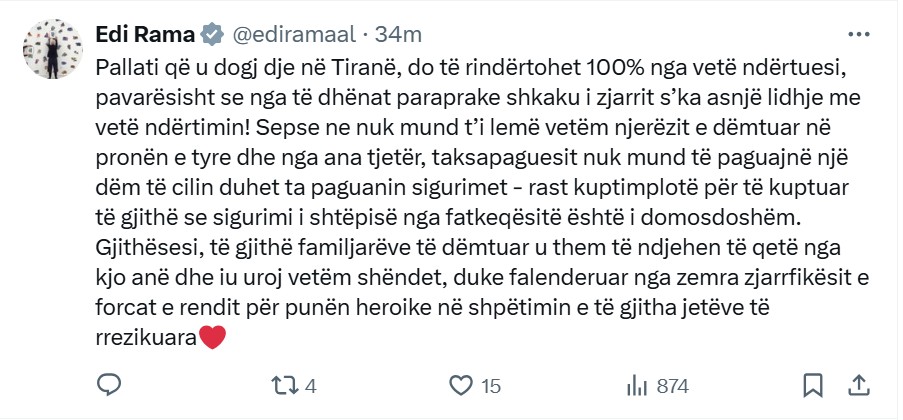 “Pallati që u dogj dje në Tiranë, do të rindërtohet 100% nga vetë ndërtuesi, pavarësisht se nga të dhënat paraprake shkaku i zjarrit s’ka asnjë lidhje me vetë ndërtimin! Sepse ne nuk mund t’i lemë vetëm njerëzit e dëmtuar në pronën e tyre dhe nga ana tjetër, taksapaguesit nuk mund të paguajnë një dëm të cilin duhet ta paguanin sigurimet – rast kuptimplotë për të kuptuar të gjithë se sigurimi i shtëpisë nga fatkeqësitë është i domosdoshëm. Gjithësesi, të gjithë familjarëve të dëmtuar u them të ndjehen të qetë nga kjo anë dhe iu uroj vetëm shëndet, duke falenderuar nga zemra zjarrfikësit e forcat e rendit për punën heroike në shpëtimin e të gjitha jetëve të rrezikuara❤️”