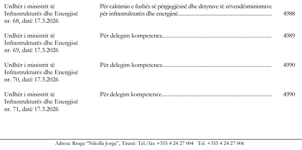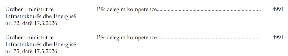 Brenda vetëm një dite, më 17 mars 2026, ministri i Infrastrukturës dhe Energjisë, Enea Karakaçi, ka firmosur 6 urdhra, ku 5 prej tyre janë urdhra për delegim kompetence. Praktikisht, ministri i ri, para se të tregojё veten nё drejtimin e qartë politik e administrativ të ministrisë, bёri një lëvizje e shpejtë për të shpërndarë firmën dhe barrën te zëvendësministrat.
