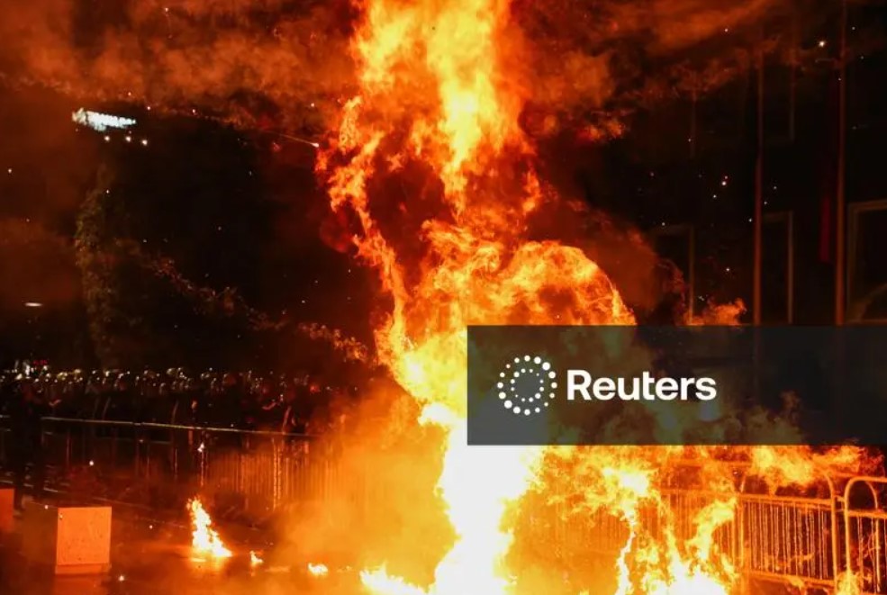 Sipas Reuters, forca të shumta policie u vendosën në formacion përpara godinës së Kryeministrisë, ndërsa flakët dhe tensionet shënuan momentet më të nxehta të protestës. Pamjet e publikuara nga agjencia tregojnë efektivët e rendit të rreshtuar përballë demonstruesve, ndërsa zjarret ngrihen pranë zonës së protestës.