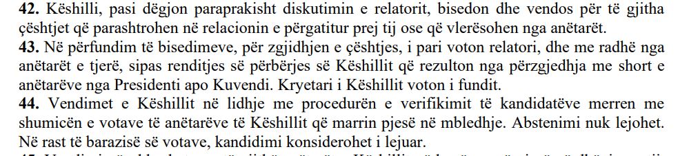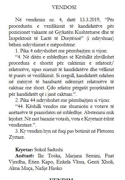 Ndryshimi më domethënës është ai i pikës 44 të Vendimit nr. 4, të vitit 2019. Deri në këtë moment, rregulli ishte i qartë: në rast barazie votash në Këshillin e Emërimeve në Drejtësi, kandidimi konsiderohej i lejuar. Pra, dyshimi interpretohej në favor të kandidatit, duke shmangur bllokimin ose filtrimin arbitrar përmes një vote individuale. Ky parashikim ishte në përputhje me parimin kushtetues të aksesit të barabartë në funksionet publike dhe me idenë se KED nuk është organ përzgjedhës vendimmarrёs e aq mё pak politik, por filtër tekniko- ligjor.