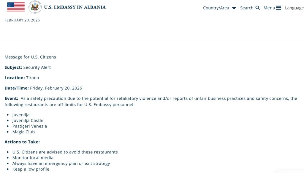 Një njoftim i Ambasadës së Shteteve të Bashkuara në Tiranë, i publikuar më 20 shkurt 2026, është rikthyer sot në vëmendjen e mediave, duke ngritur pikëpyetje jo vetëm për sigurinë, por edhe për arsyet konkrete që qëndrojnë pas tij.