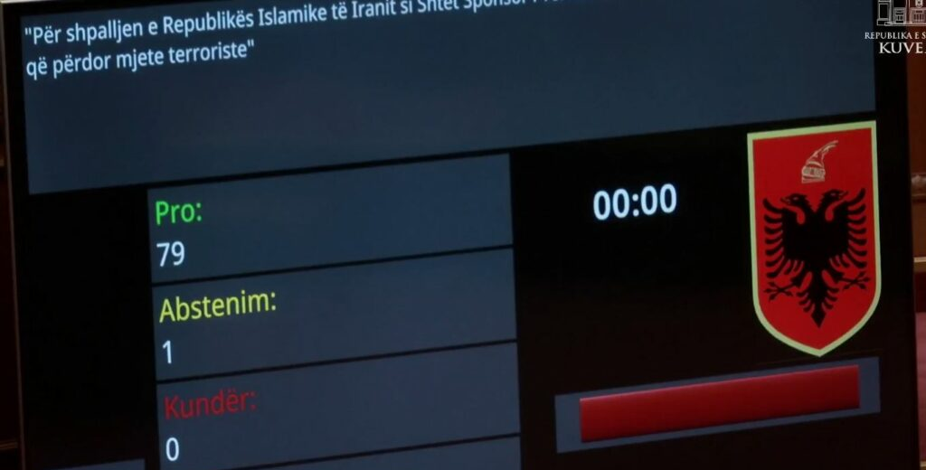 Kuvendi i Shqipërisë miratoi sot me 79 vota të mazhorancës socialiste një rezolutë që e shpall Iranin si “shtet sponsor të terrorizmit”. Opozita bojkotoi seancën pa asnjë koment, ndёrsa pёrfaqёsuesi i partisё sё Arlind Qorrit, Redi Muҫi, kritikoi iniciativёn pёr t’iu kundёrvёnё Iranit, pёr sa kohё lufta ёshtё hapur nga Benjamin Netanjahu, njё i kёrkuar nga drejtёsia ndёrkombёtare dhe pёr sa kohё qё Evropa nuk po pёrfshihet nё sulmin ushtarak SHBA-Izrael.