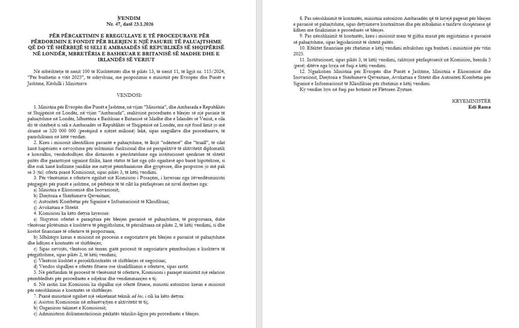 Qeveria ka miratuar VKM nr. 47, datë 23.1.2026, të botuar sot në Fletoren Zyrtare, “Për përcaktimin e rregullave e të procedurave për përdorimin e fondit për blerjen e një pasurie të paluajtshme që do të shërbejë si seli e Ambasadës së Republikës së Shqipërisë në Londër, Mbretëria e Bashkuar e Britanisë së Madhe dhe e Irlandës së Veriut.” Vendimi synon të hapë rrugën për blerjen e një prone që do të përdoret si ambasadë, duke ngarkuar Ministrinë për Evropën dhe Punët e Jashtme dhe vetë misionin diplomatik në Londër me identifikimin e godinës, negocimin dhe ndjekjen e procedurave deri në finalizimin e kontratës.