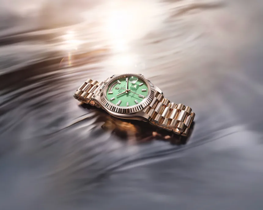 Ky interpretim i ri i arit të verdhë është më i butë në ton, me nënnuanca gri dhe rozë të lehtë. Oyster Perpetual Day-Date 40, me çmim 62,700 dollarë, është modeli i parë që përdor këtë nuancë të re, i kombinuar me një fushё jeshile pranverore që tërheq menjëherë vëmendjen, i plotësuar me diamante të prerjes baguette. Nëse keni qenë ndonjëherë në dilemë mes arit rozë dhe atij të verdhë, tani përgjigjja është e qartë — Jubilee Gold i bashkon të dyja.