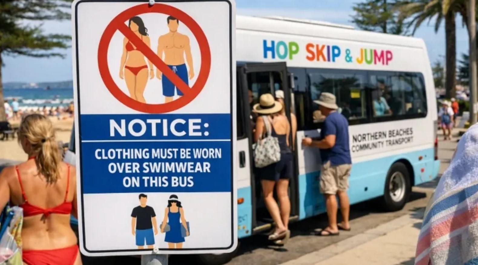 “Ju lutemi të visheni siç duhet. Duhet të mbani rroba mbi rrobat e plazhit,” thuhet në një tabelë të vendosur në autobusin Hop, Skip and Jump, i financuar nga Këshilli i Northern Beaches dhe që qarkullon në zonat bregdetare Manly, Fairlight dhe Balgowlah.