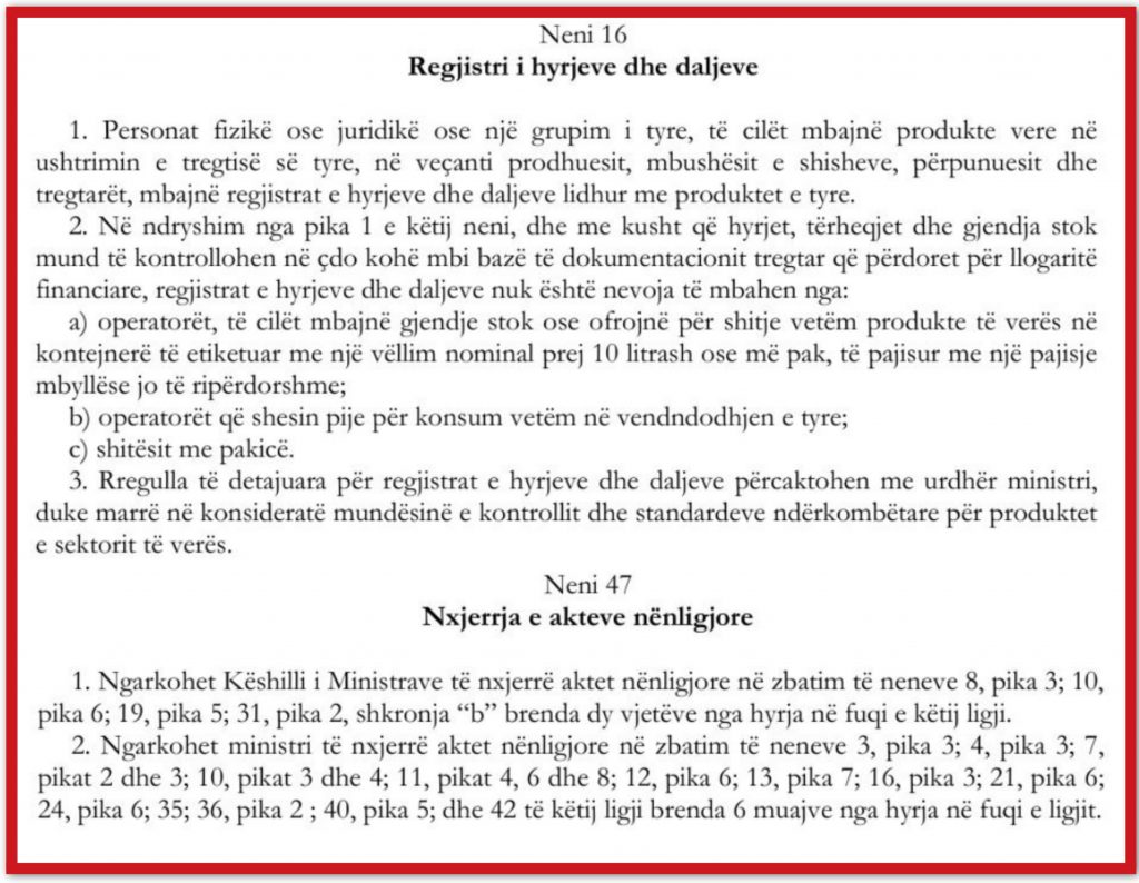 Në dukje, bëhet fjalë për akte teknike, që i impononte Ligji “Për vreshtarinë dhe verën”, me numër 86/2022, që ka hyrë në fuqi në janar 2023. Aktet nënligjore të këtij ligji duhet të dilnin brenda 6 muajve, por ato u harruan. Asnjë urdhër në 2023, asnjë në 2024, asnjë gjatë gjithë vitit 2025.