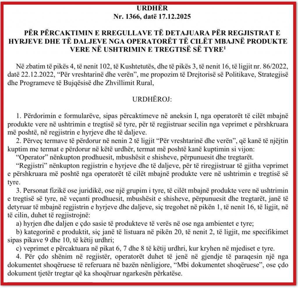 Urdhri i ministrit Salla përcakton format konkrete të regjistrave, mënyrën e mbajtjes dhe dokumentacionin shoqërues të produkteve të verës. Deri më 17 dhjetor 2025, ky mekanizëm me vlerë të madhe juridike për të arratisurit prej SPAK nuk ekzistonte. Ligji ishte aty, por shteti kishte zgjedhur të mos e zbatonte. Ky boshllëk i krijuar qëllimisht për më shumë se dy vjet sot i shërben drejtpërdrejt një çështjeje penale, duke e zhvendosur verën nga kategoria e provës materiale të krimit në një stok të paregjistruar për shkak të mungesës së aktit nënligjor.