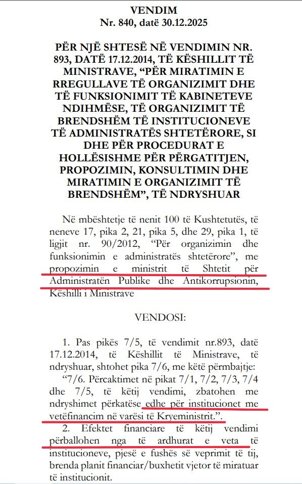 Listës së gjatë të ministrive dhe institucioneve shtetërore që punësojnë persona jashtë strukturës, në formën e “këshilltarëve”, apo anёtarёve tё bordeve të paguara nga buxheti i shtetit, i shtohen edhe institucione me “vetëfinancim” në varësi të Kryeministrit. Ky zgjerim i skemës së “këshillimeve të jashtme” është propozuar nga vetë ministrja e Shtetit për Administratën Publike dhe Antikorrupsionin, Adea Pirdeni, dhe është miratuar me Vendimin e Këshillit të Ministrave nr. 840, datë 30 dhjetor 2025.